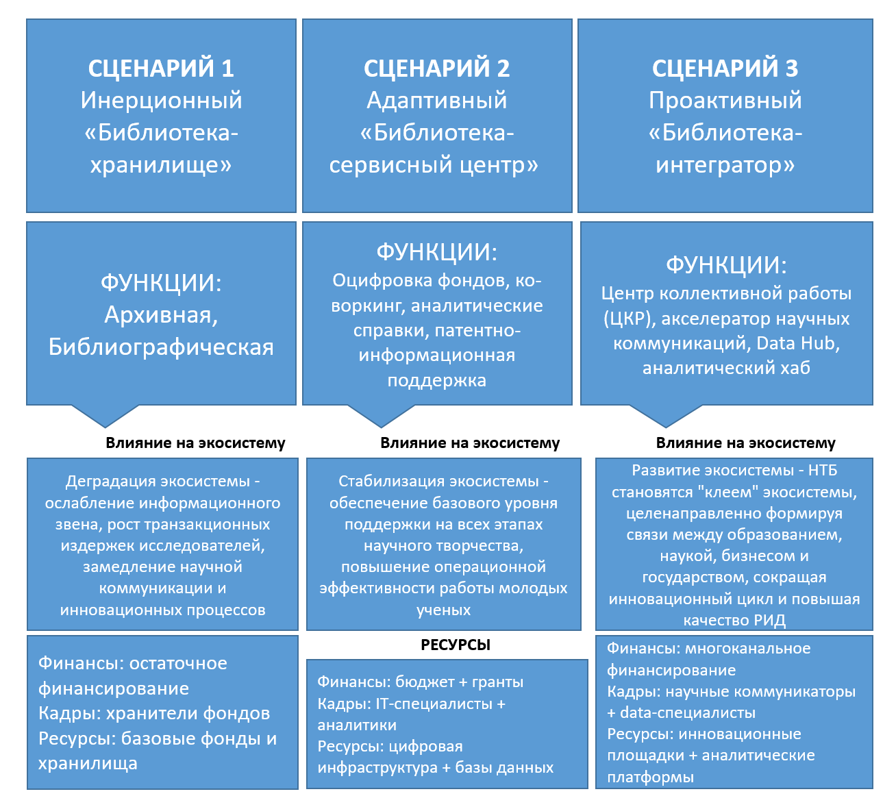 На основе проведенного анализа были разработаны три сценария развития НТБ: инерционный («Библиотека-хранилище»), адаптивный («Библиотека-сервисный центр») и проактивный («Библиотека-интегратор и генератор экосистемных связей»). Каждый из сценариев оценивается с точки зрения вероятности реализации, ресурсного обеспечения и потенциального воздействия на экосистему. Целевым признан проактивный сценарий, который предполагает глубинную трансформацию НТБ в драйверы инновационных процессов.