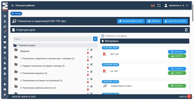 Рисунок 2. Курс по учебной дисциплине в ЭИОС АНОО ВО «ВЭПИ»