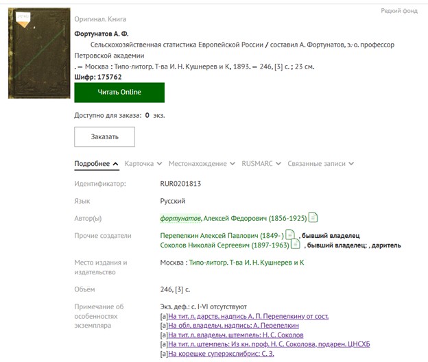 Таким образом, в ЭК ЦНСХБ формируется коллекция книг с владельческими знаками, сформированы фасеты по типу книжного знака и организован поиск по соответствующим элементам записи. В библиографических записях на книги пользователям представлена информация о владельческих знаках в расширенной текстовой форме, точки доступа на персоны и организации, ассоциированные с владельческими знаками, доступны отсканированные изображения знаков. Деятельность по выявлению книг с владельческими книжными знаками в фонде ЦНСХБ, отражение сведений о знаках в каталоге и представление их для пользователей способствует сохранению и популяризации истории и культурного наследия нашей страны.
